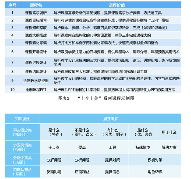为降低学员入门难度,提升学习吸收转化率,我们主张告别单一的面授形式,将课程开发的步骤方法进行落地化、碎片化的拆分。提供“拿走即用的内容干货”是小Hi线上MOOC学习的设计理念,其“十全十美”系列课程是对ADDIE更为简化、细化的理解(见图表2),每一步都配套一个上手即用的工具模板(见图表3),让学员在进入工作坊之前就能快速领会课程开发的关键步骤,搭建结构化思维,萃取隐性的知识经验,再循序渐进地产出。